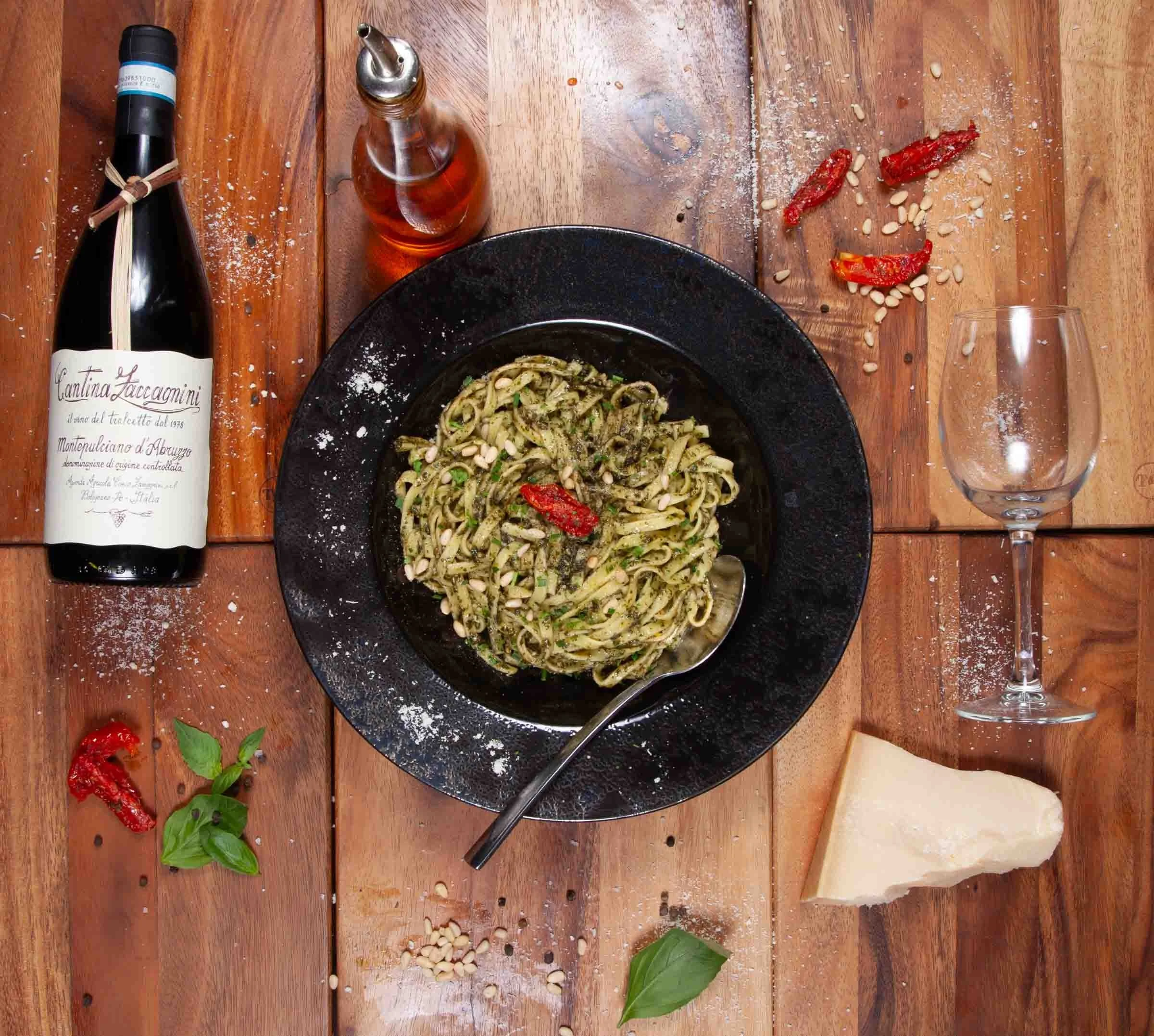 Tagliatelles, basilic, pignons de pin, huile d’olive, ail