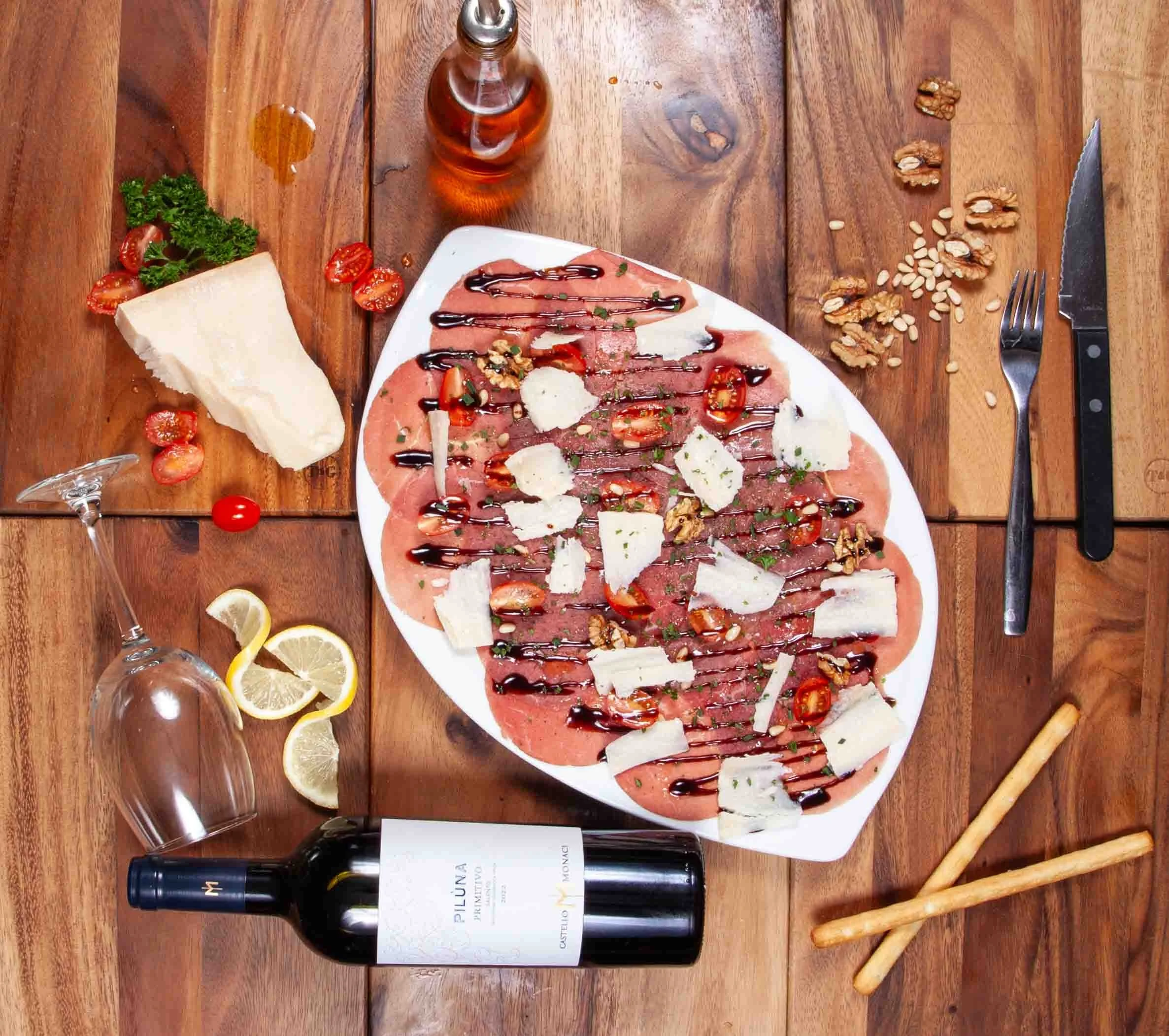 Bœuf Angus 70 grammes, huile d’olive parfumée, copeaux de parmesan, tomates cerises, velours de balsamique et fleur de sel
